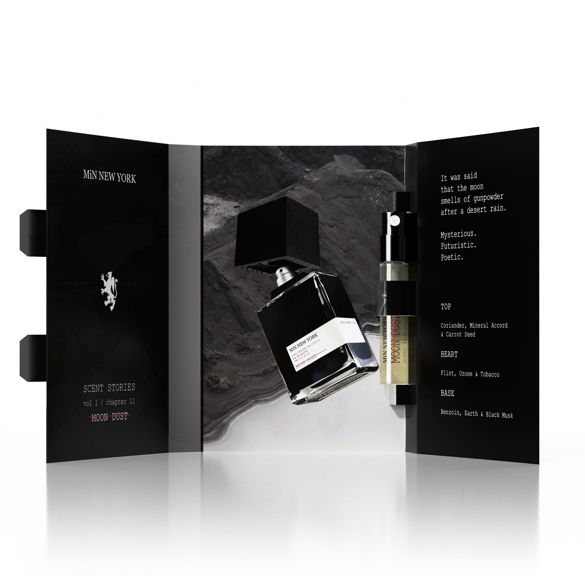 MOON DUST is a Woody Powdery Ambery fragrance that captures the enigmatic scent of the lunar surface — a bold fusion of the ethereal and the primal. Inspired by astronauts’ accounts of lunar dust as “spent gunpowder,” it opens with coriander, mineral accord, and carrot seed, evoking a dry, rooty brightness. The heart reveals flint, ozone, and tobacco, unfolding ashen smoke and leathery depth against the silence of space. Anchored by benzoin, black musk, and earth, the base lingers with a powdery, mysterious warmth — like cosmic dust settling on skin. Iconic and otherworldly, MOON DUST is a cult creation within MiN NEW YORK’s olfactory anthology, crafted for those who dream beyond the stars.